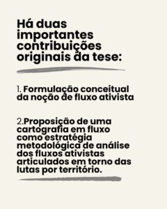 A segunda contribuição central é a proposição de uma cartografia em fluxo como estratégia metodológica de análise dos fluxos ativistas articulados em torno das lutas por território. Essa proposta metodológico-analítica oferece uma estratégia robusta para a contextualização radical das articulações ativistas, permitindo acompanhar seus deslocamentos, conexões e reconfigurações em diferentes escalas. Ao sistematizar esse percurso, a tese apresenta uma contribuição relevante de origem brasileira para os estudos culturais e para as abordagens metodológicas voltadas à análise de processos comunicacionais complexos.